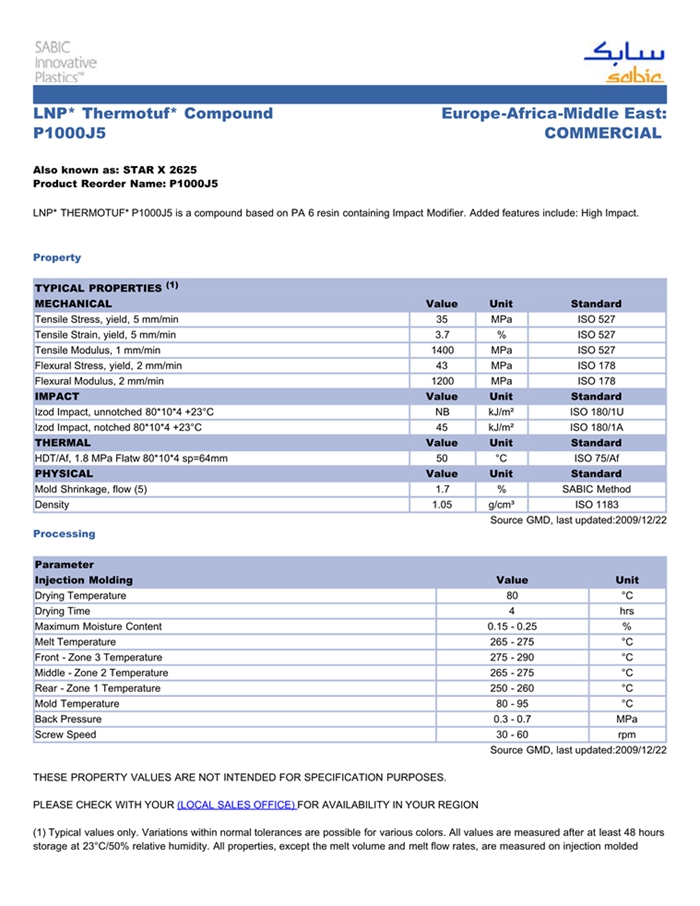 应用范围: 产品描述 LNP THERMOTUF P1000J5物性表 LNP* THERMOTUF* P1000J5 is a compound based on PA 6 resin containing Impact Modifier. Added features include: High Impact.