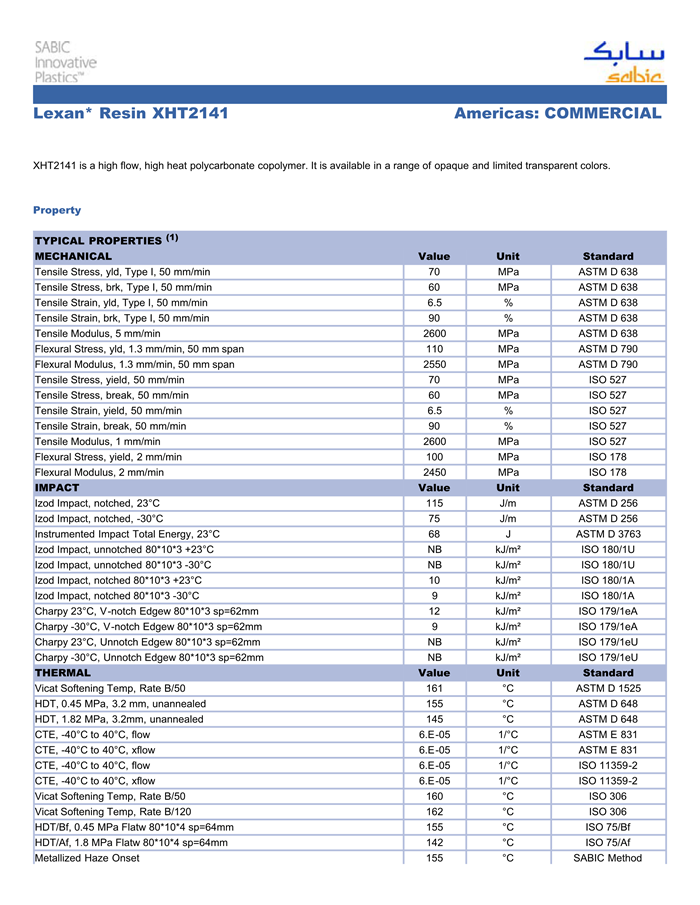 Lexan XHT2141 resin是一种聚碳酸酯(PC)产品,它可以通过注射成型进行加工。