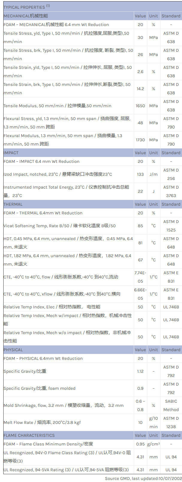 应用范围:产品描述NORYL PPO FN5622物性表FOAM MATERIAL. PROPERTIES BASED ON 0.250″ SPECIMENS; 20% WEIGHT REDUCTION. PPE+PS (PX5622 base) material foamed. Business equipment applications.