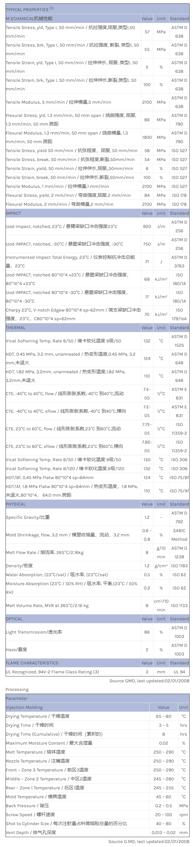 应用范围:产品描述XYLEX PC/PET X7503物性表Clear PC-Siloxane copolymer + Polyester alloy